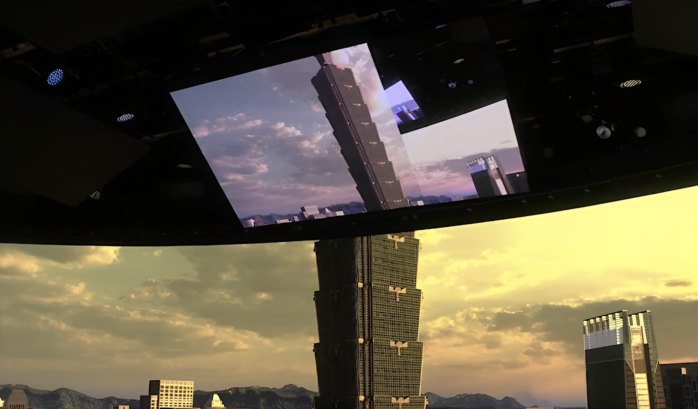 懸吊式LED P2.3 無縫拼接、拍攝無掃描線及摩爾紋,懸吊結構弧度可依需求調整 (2度/3度/4度) 快拆式模組化電視牆面板。